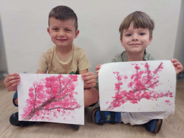 Żabki🐸 Gałązka kwitnącej wiśni – praca plastyczna Żabek. 🤗🌿🌸🤗🌿🌸